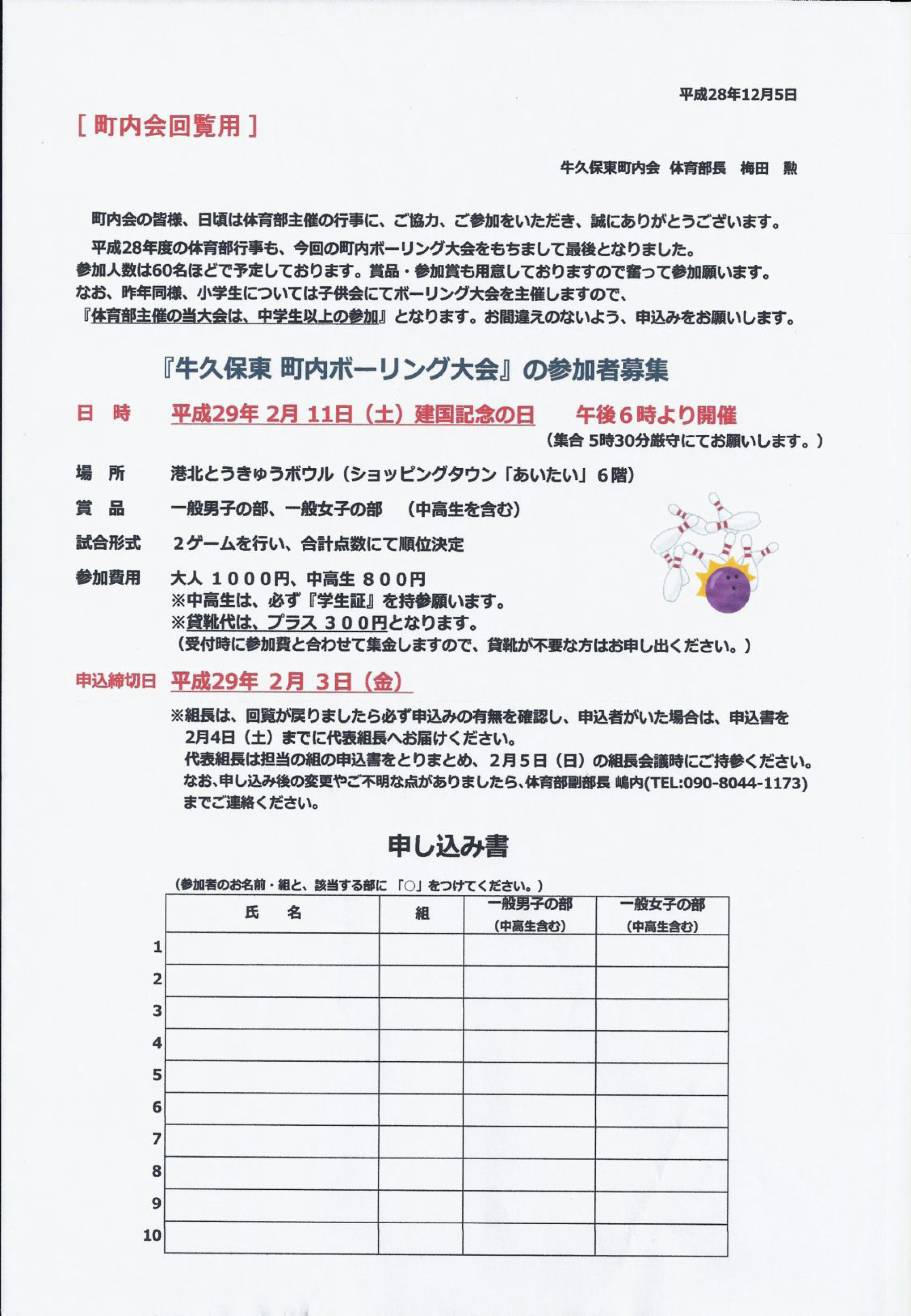 町内ボーリング大会の参加者募集