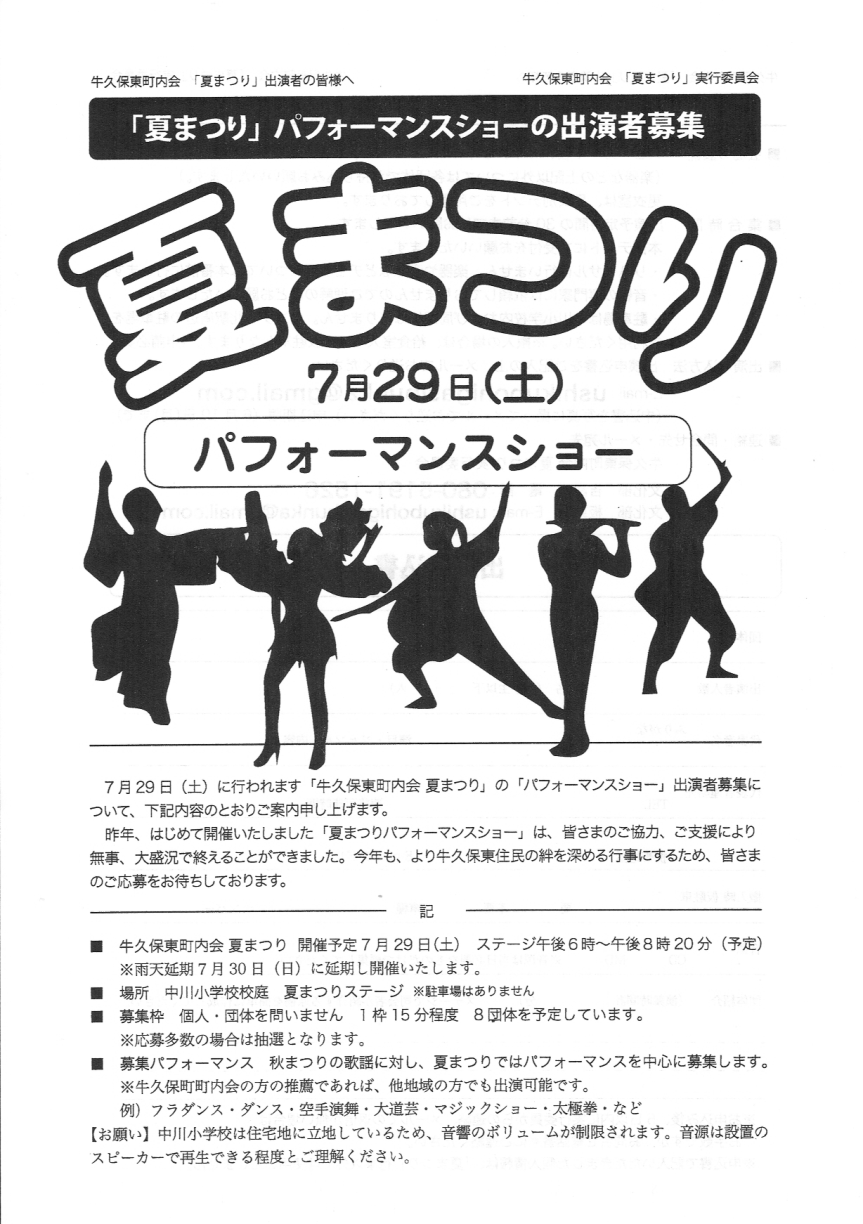パフォーマー募集します!!夏まつり2017 昨年大好評をいただいた「夏まつりパフォーマンスショー」。今年も7/29(土)に開催します。ステージを彩るのはあなたです!ご応募お待ちしています!! こちらからダウンロードしてお申し込みください。夏まつりパフォーマー申込書 共有: クリックして X で共有 (新しいウィンドウで開きます) X Facebook で共有するにはクリックしてください (新しいウィンドウで開きます) Facebook クリックして印刷 (新しいウィンドウで開きます) 印刷 関連