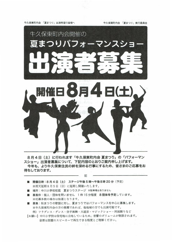今年もパフォーマー大募集します!!2018夏まつり! 今年の夏まつりは8月4日(土)開催です。 みんなでつくる夏まつり、パフォーマンスステージを彩るのはあなたです!ご応募お待ちしています!! こちらからダウンロードしてお申込みください。2018夏まつりパフォーマー申込書 共有: クリックして X で共有 (新しいウィンドウで開きます) X Facebook で共有するにはクリックしてください (新しいウィンドウで開きます) Facebook クリックして印刷 (新しいウィンドウで開きます) 印刷 関連
