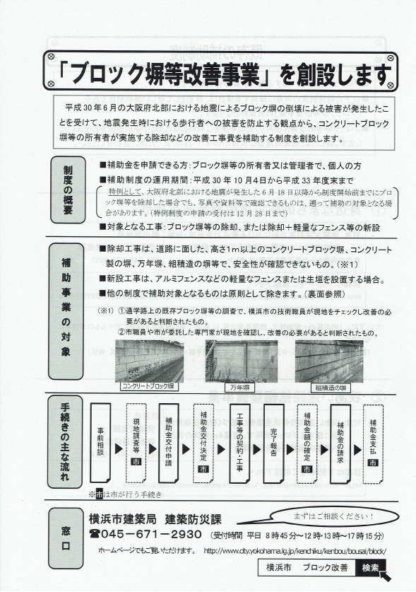 ブロック塀等改善事業 コンクリートブロック塀等の所有者が実施する除去などの改善工事費の補助制度が創設されます。 ブロック塀等改善事業 共有: クリックして X で共有 (新しいウィンドウで開きます) X Facebook で共有するにはクリックしてください (新しいウィンドウで開きます) Facebook クリックして印刷 (新しいウィンドウで開きます) 印刷 関連