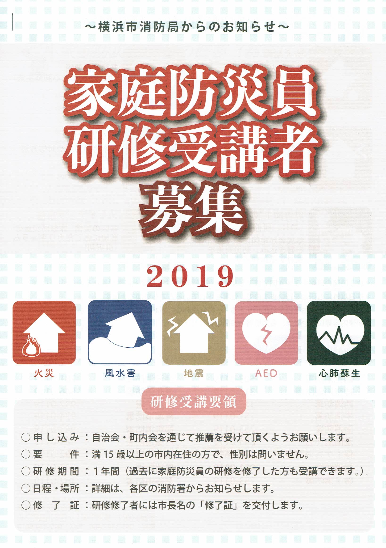 ~横浜市消防局からのお知らせ~家庭防災員研修受講者を募集します 共有: クリックして X で共有 (新しいウィンドウで開きます) X Facebook で共有するにはクリックしてください (新しいウィンドウで開きます) Facebook クリックして印刷 (新しいウィンドウで開きます) 印刷