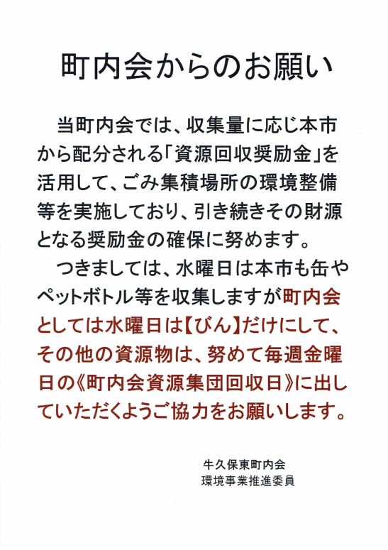みんなで「資源回収奨励金」確保に協力しましょう!! この「町内会資源集団回収」と、新聞・古布・牛乳パックの「ツキイチ戸口回収」での奨励金は町内会の大きな収入源になっています。ところが、ここ3年間をみると、 27年度 765,605円 28年度 732,176円 29年度 733,431円 と漸減、低迷しているのが気になるところです。町内の環境整備を推進するためにも是非皆さんご協力ください!! 共有: クリックして X で共有 (新しいウィンドウで開きます) X Facebook で共有するにはクリックしてください (新しいウィンドウで開きます) Facebook クリックして印刷 (新しいウィンドウで開きます) 印刷 関連