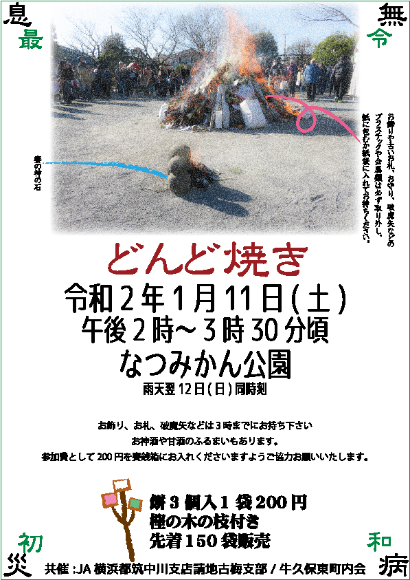 令和最初のどんど焼き2020.1.11 お餅の販売は先着150袋です。 共有: クリックして X で共有 (新しいウィンドウで開きます) X Facebook で共有するにはクリックしてください (新しいウィンドウで開きます) Facebook クリックして印刷 (新しいウィンドウで開きます) 印刷
