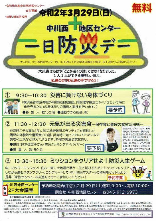 開催中止となりました。3/29中川西地区センターで一日防災デー(参加無料) 開催中止となりました。 共有: クリックして X で共有 (新しいウィンドウで開きます) X Facebook で共有するにはクリックしてください (新しいウィンドウで開きます) Facebook クリックして印刷 (新しいウィンドウで開きます) 印刷 関連