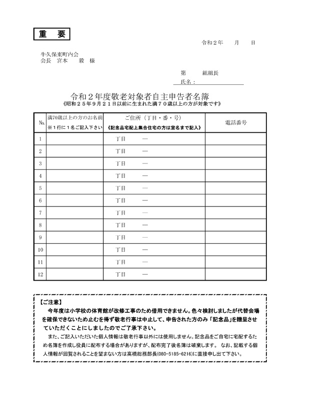 令和2年度敬老対象者自主申告のお知らせと「敬老会」の中止について 牛久保東町内会では、毎年申告いただいた方を対象に、9月の敬老の日に開催する「敬老会」のご案内と「記念品」の贈呈を行っています。しかし、今年度は小学校の体育館が改修工事のため借用できず、また、代替会場も確保できないためやむを得ず「敬老会」は中止し、申告された方のみ「記念品」を贈呈させていただくことにしました。 対象は昭和25年9月21日以前に生まれた満70歳以上の方です。町内会回覧板に添付される名簿(下記参照)にご記入ください。 共有: クリックして X で共有 (新しいウィンドウで開きます) X Facebook で共有するにはクリックしてください (新しいウィンドウで開きます) Facebook クリックして印刷 (新しいウィンドウで開きます) 印刷 関連