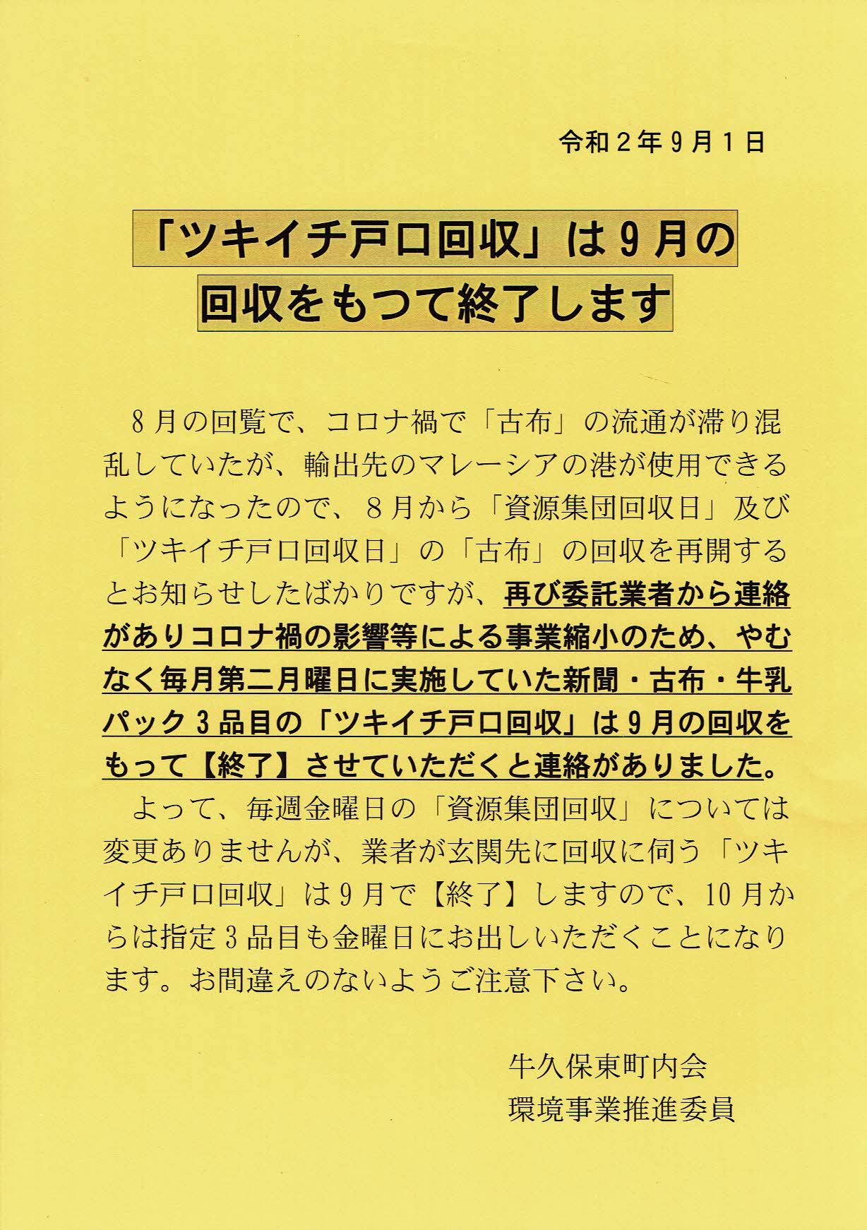【終了】ツキイチ戸口回収は9月いっぱいで終了します 毎月第二月曜日に、新聞・古布・牛乳パックを玄関先まで業者が回収に来てくれる「ツキイチ戸口回収」でしたが、残念ながら9月末で終了します。10月からは毎週金曜日の「資源集団回収」で、空き缶・ペットボトルなどと一緒に回収されますのでご注意ください。 共有: クリックして X で共有 (新しいウィンドウで開きます) X Facebook で共有するにはクリックしてください (新しいウィンドウで開きます) Facebook クリックして印刷 (新しいウィンドウで開きます) 印刷