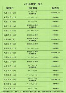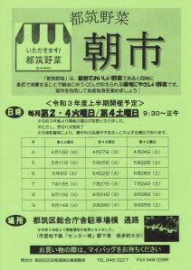 地産地消をすすめよう!!都筑野菜“朝市”開催スケジュール 区役所庁舎で毎月開催されている都筑区の生産者による朝市に行ってみませんか?4月から半年間のスケジュールです。 共有: クリックして X で共有 (新しいウィンドウで開きます) X Facebook で共有するにはクリックしてください (新しいウィンドウで開きます) Facebook クリックして印刷 (新しいウィンドウで開きます) 印刷 関連