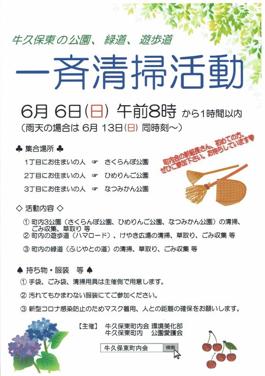 6/6の一斉清掃活動にご参加ください 牛久保東の公園、緑道、遊歩道をみなさんの力で美しく保とう!! 共有: クリックして X で共有 (新しいウィンドウで開きます) X Facebook で共有するにはクリックしてください (新しいウィンドウで開きます) Facebook クリックして印刷 (新しいウィンドウで開きます) 印刷 関連