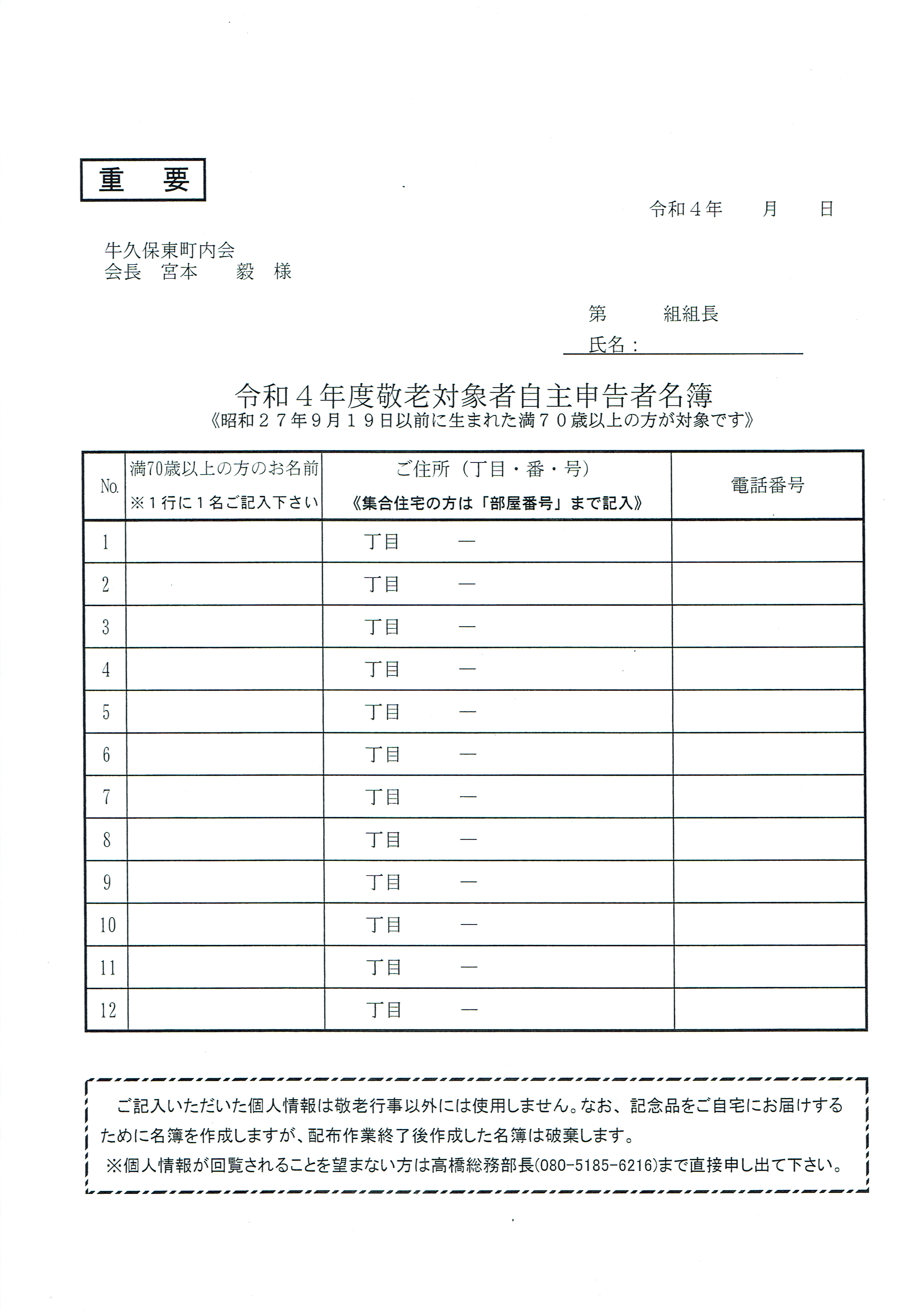例年、牛久保東町内会では敬老の会を開いてきました。ただ、コロナ禍の一昨年は手作りマスクをお渡ししたり、昨年は記念品贈呈のみを行ってきています。今年も記念品の宅配を計画しています。ぜひご登録ください。下記のリストが回覧板で回りますので昭和27年9月19日以前に生まれた方はご記入ください。
