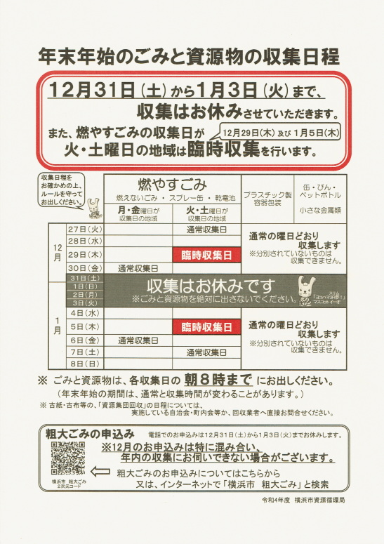 【ご注意ください】2022-23 年末年始のゴミ収集情報 当町内会は火・土曜日が燃やすごみの日なので29日と5日に臨時収集となります。ご注意ください。 共有: クリックして X で共有 (新しいウィンドウで開きます) X Facebook で共有するにはクリックしてください (新しいウィンドウで開きます) Facebook クリックして印刷 (新しいウィンドウで開きます) 印刷 関連