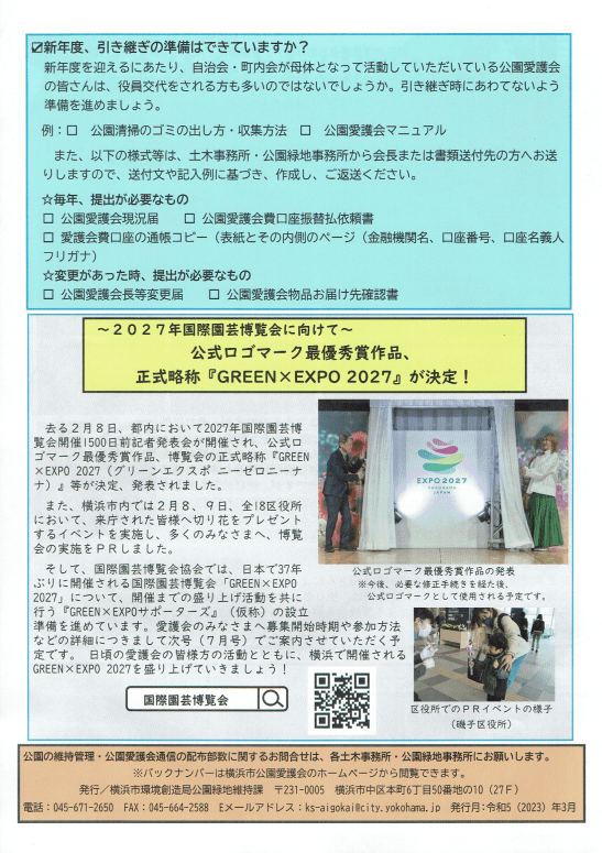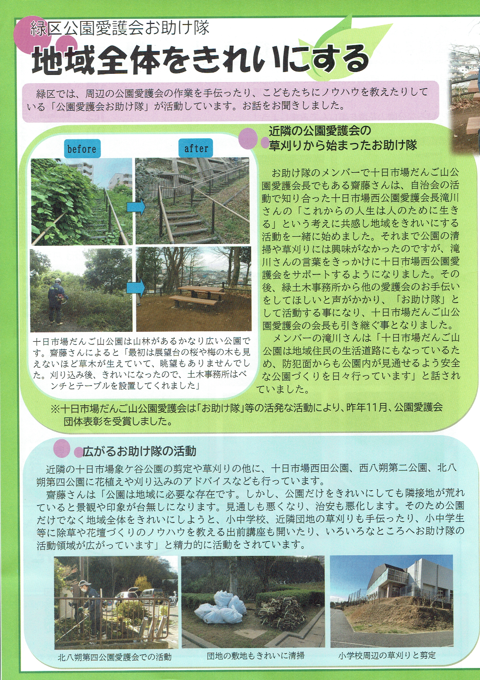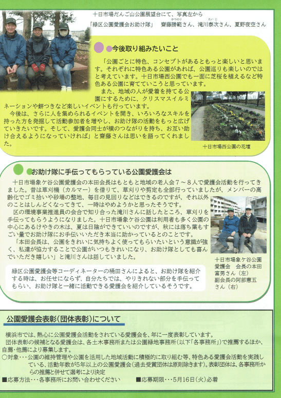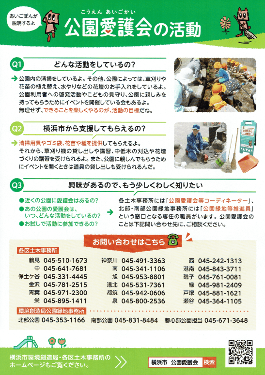 それぞれの公園に公園愛護会がありますが、町内会ではこの4つの公園愛護会と自転車歩行者専用道路の部分を受け持つ牛久保東ハマロードサポーターを合わせて公共空間の美化を心掛ける「環境美化部」を組織しています。一斉清掃でおなじみですね。でも活動は義務ではありません。緑豊かなこのまちを守りたい人ならだれでも参加は自由です。お掃除の好きな人、花のお世話が好きな人、木々のお手入れが好きな人、活動を通じてふれあいが深まります。居心地よいまちづくりのきっかけに一度各公園に足を向けてみてはいかがでしょう。