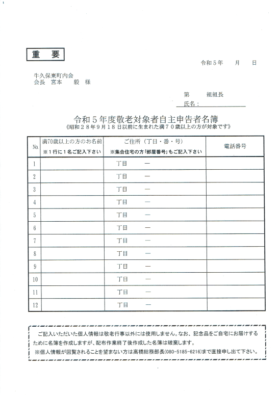 満70才以上の方へ 今年度は9月18日(月・敬老の日)に、中川小学校体育館で町内会の敬老会を4年ぶりに開催します。そこで今年度も個人情報保護等の視点から敬老対象者の把握は「自主申告方式」で行いますので、ご協力下さい。 申告されなかった方はご辞退されたものと解釈し、敬老会のご案内と記念品の配付を割愛させていただきますのでご了承下さい。 9月18日で満70歳以上(誕生日が昭和28年9月18日以前)の方はご面倒ですが、回覧の【敬老対象者自主申告者名簿】にお名前・ご住所・電話番号をご記入下さい。下記は見本です。 共有: クリックして X で共有 (新しいウィンドウで開きます) X Facebook で共有するにはクリックしてください (新しいウィンドウで開きます) Facebook クリックして印刷 (新しいウィンドウで開きます) 印刷 関連