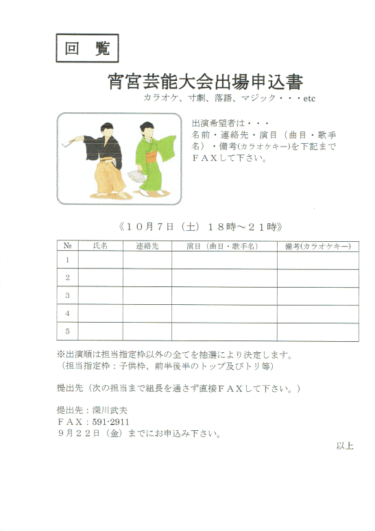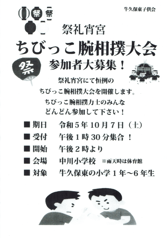 10/7.8牛久保東の秋祭り。宵宮は中川小学校でおこないます。 牛久保東町内会祭礼は、4年ぶりに10月7日(土)ちびっこ腕相撲大会、宵宮芸能大会。10月8日(日)子供神輿と山車の町内巡行が行われます。まずは、10/7の参加者、出場者を大募集します! ふるってご応募ください!! 9月の回覧資料でより詳しくお伝えします。 ↓こちらは神社での催しです 共有: クリックして X で共有 (新しいウィンドウで開きます) X Facebook で共有するにはクリックしてください (新しいウィンドウで開きます) Facebook クリックして印刷 (新しいウィンドウで開きます) 印刷 関連