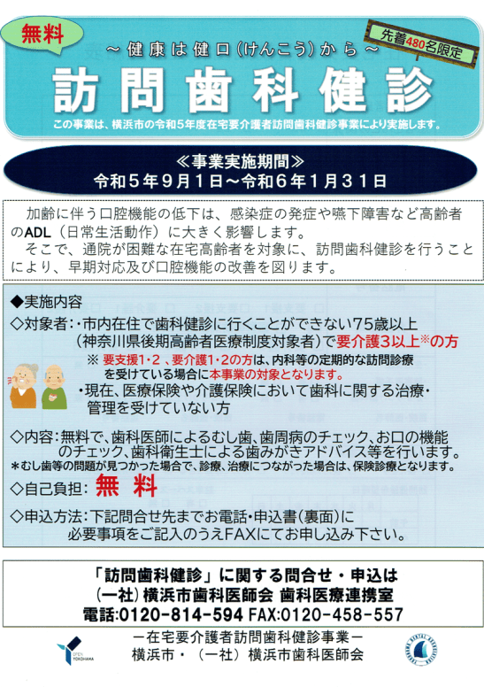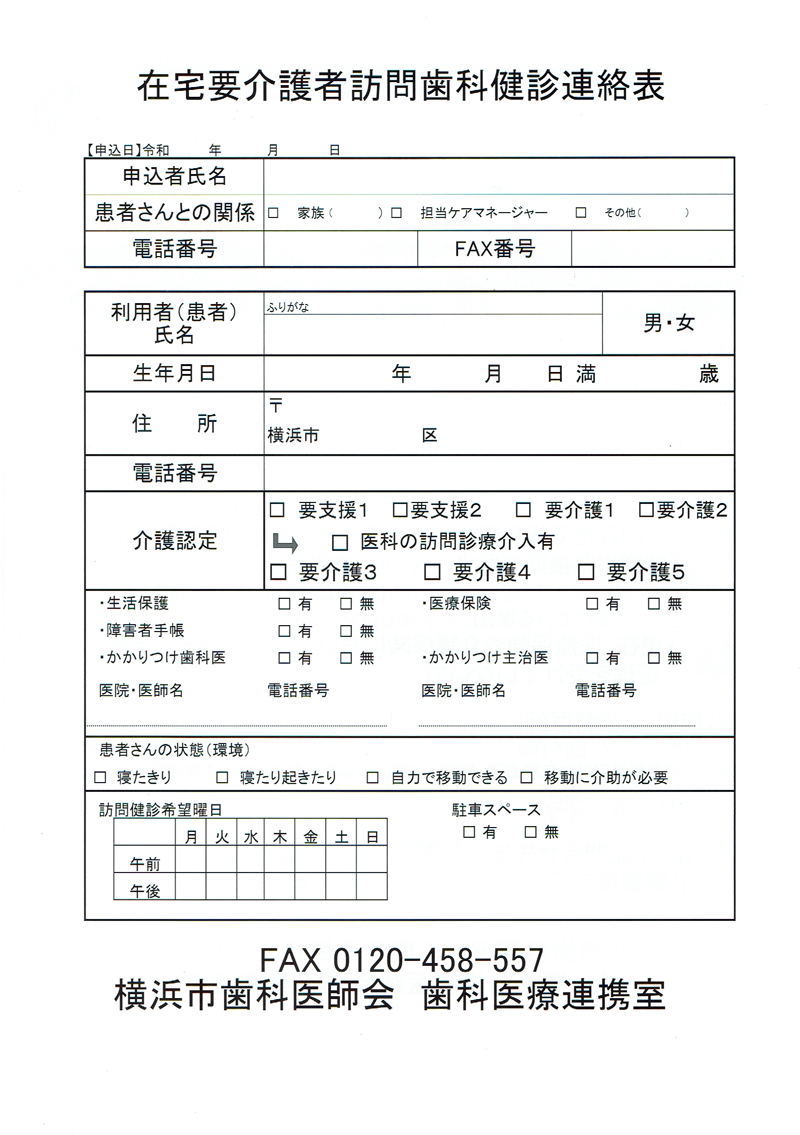 訪問歯科検診の申込書です 先着480名限定!! 横浜市の令和5年度在宅要介護者訪問歯科検診事業のご紹介 共有: クリックして X で共有 (新しいウィンドウで開きます) X Facebook で共有するにはクリックしてください (新しいウィンドウで開きます) Facebook クリックして印刷 (新しいウィンドウで開きます) 印刷 関連