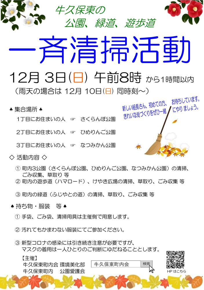 みんなで一緒にまちの美化を──12月アタマの一斉清掃のお知らせです 回覧板での告知が間に合わないおそれのある月初めの一斉清掃のお知らせです。誰でもできるゴミ拾いなど、ぜひ環境美化にご協力ください。 共有: クリックして X で共有 (新しいウィンドウで開きます) X Facebook で共有するにはクリックしてください (新しいウィンドウで開きます) Facebook クリックして印刷 (新しいウィンドウで開きます) 印刷