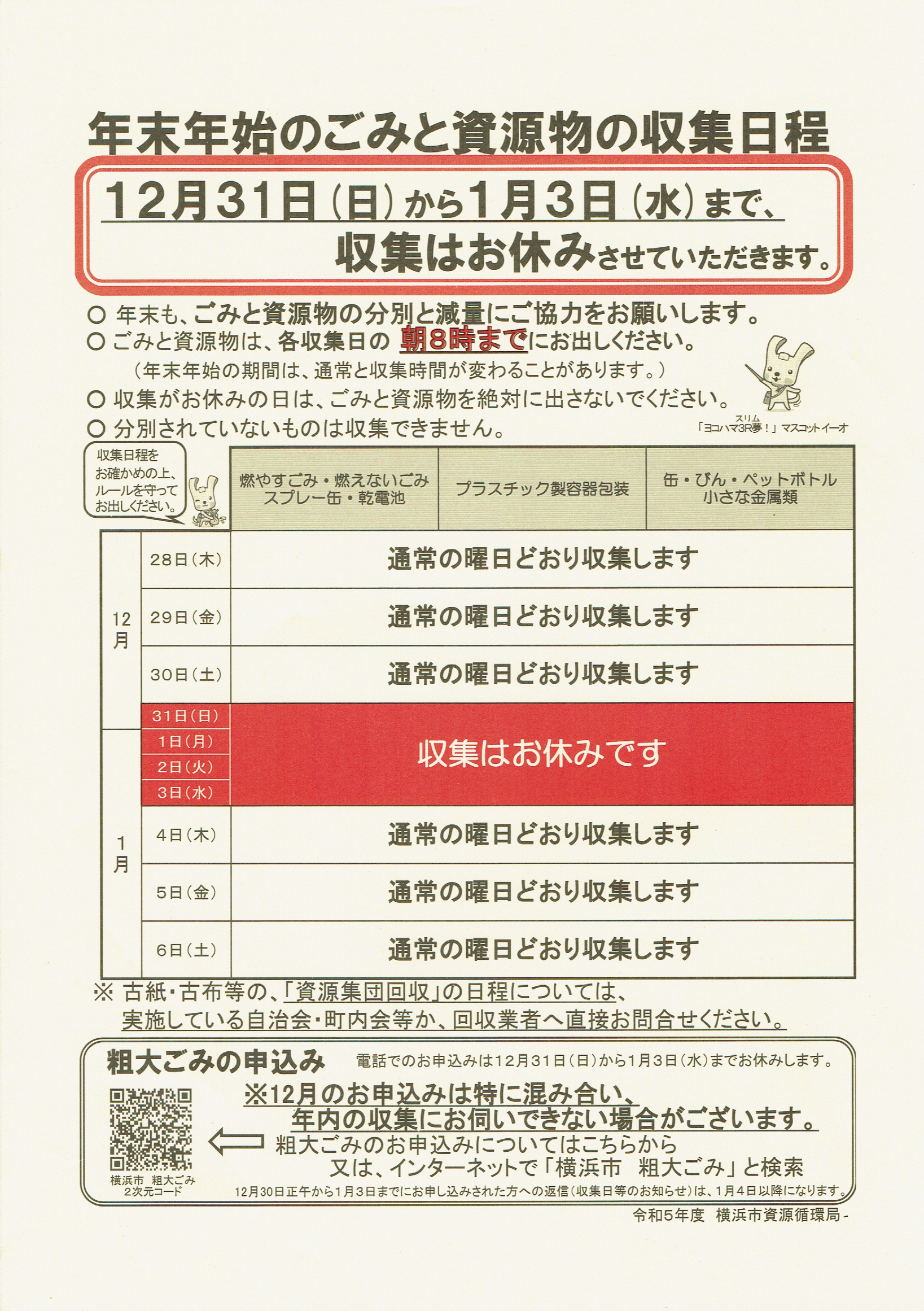 【ご注意ください】2023-24年末年始のゴミ収集日 年末年始のゴミ収集日は12/31(日)~1/3(水)がお休みです! 指定日以外のゴミ出しは【厳禁】です。ご協力ください! 共有: クリックして X で共有 (新しいウィンドウで開きます) X Facebook で共有するにはクリックしてください (新しいウィンドウで開きます) Facebook クリックして印刷 (新しいウィンドウで開きます) 印刷 関連
