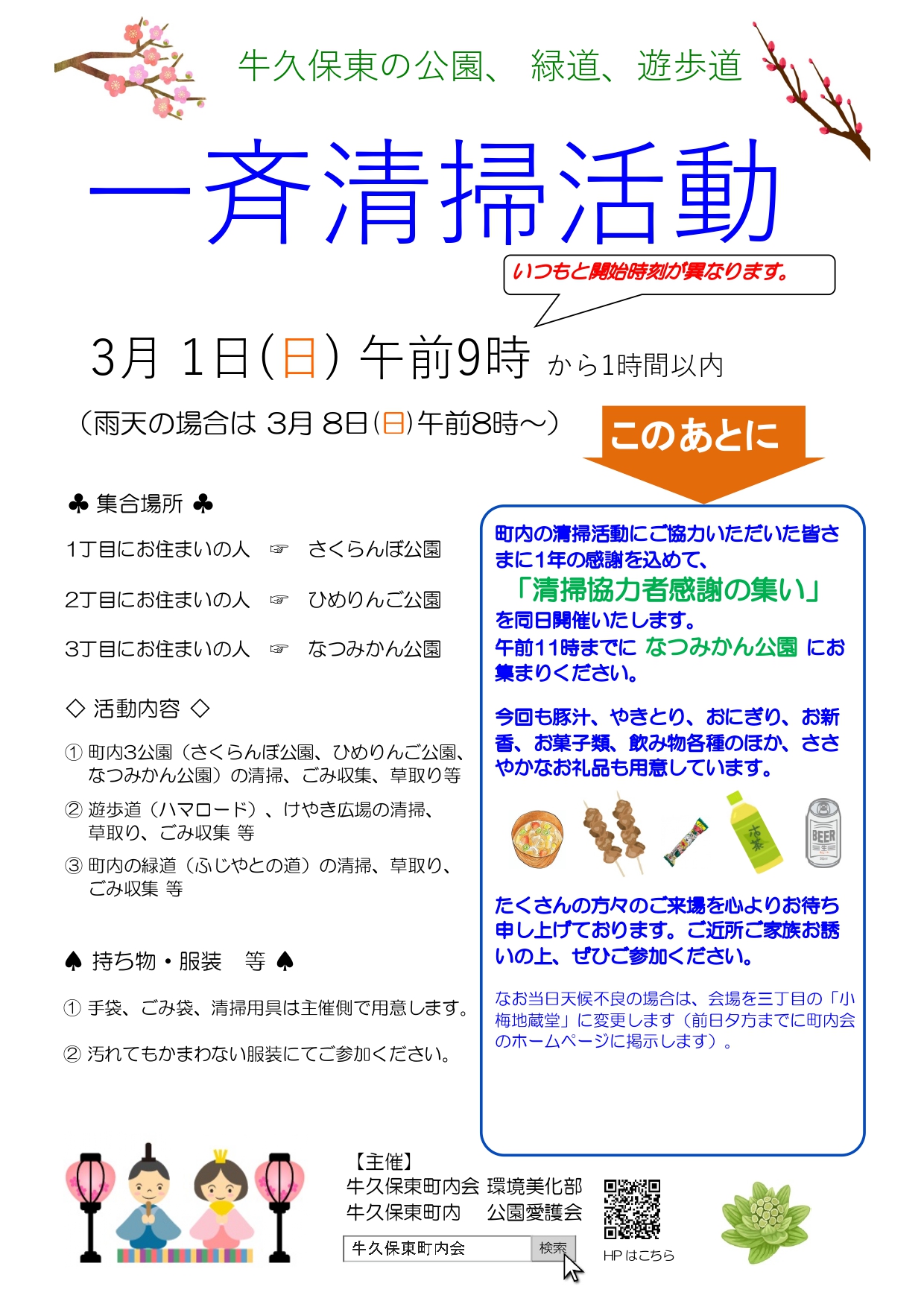 令和8年3月の一斉清掃は3/1(日)です 共有: X で共有 (新しいウィンドウで開きます) X Facebook で共有 (新しいウィンドウで開きます) Facebook 印刷 (新しいウィンドウで開きます) 印刷