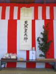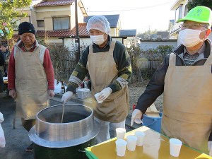 開発で新住民が増える中、地元の伝統行事を通じ顔見知りをつくってもらおうと、町内会も共催して復活したのは16年前の平成14年。フォレストパークの東、大棚の農園付き公園上の山の一角に移転した「賽の神」から「賽の神の石」をなつみかん公園に持ってきて行うようになったそうです。